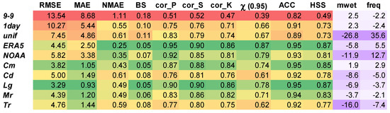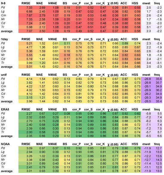 The performance of the different adjustment methods can be discussed based on the values of the indicators reported in Figure 5, where the 0–24 datasets were used as reference. For each method, the average calculated for all the stations was also provided. Cor_P, cor_S, and cor_K indicate the Pearson, Spearman, and Kendall correlation coefficients, respectively. Two different color scales were used for the columns: (i) a three-color scale (green-yellow-red) for the indicators related to temporal alignment, i.e., from RMSE to HSS; and (ii) a double-ended (white-violet) color scale for the indicators related to precipitation statistics, i.e., mean value over wet days (mwet) and frequency (freq). The indicators of temporal alignment were evaluated considering their relative value—the ones related to precipitation statistics in their absolute value. In fact, a method performs better the larger or smaller the temporal alignment indicators are in relative value, depending on the indicator; the green color indicates the best performing method, the red color the worst performing one. As an example, a good method has a low RMSE and MAE and a high cor_P, cor_S, and cor_K. At the same time, a method performs better the smaller the indicators of precipitation statistics are in absolute value (i.e., white color), and worse the higher they are in absolute value (i.e., violet color).