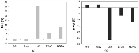 The results of the various methods applied to different stations are consistent between them, as the indicators for the same method show no significant differences between stations. The reanalysis-based methods, especially ERA5, produce the greatest increases in temporal alignment. In fact, the ERA5 method is characterized by the highest correlation coefficients (i.e., cor_P, cor_S, and cor_K), χ(0.95), accuracy, and HSS, and by the lowest errors (i.e., RMSE, MAE, NMAE) and BS. Also, the 1-day and unif methods produce an improvement in temporal alignment. Therefore, in the absence of reanalysis data, they can be considered valid alternatives to adjust the 9–9 series. Concerning the precipitation statistic, the values averaged over all stations reported in Figure 5 are better visualized in Figure 6. The unif method produces large changes in frequency and mean value over wet days, increasing the former and decreasing the latter. The reanalysis-based methods introduce changes in the same directions but to a smaller extent than the unif method. Finally, the 1-day method produces inconsistent improvements in the statistics.