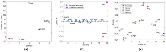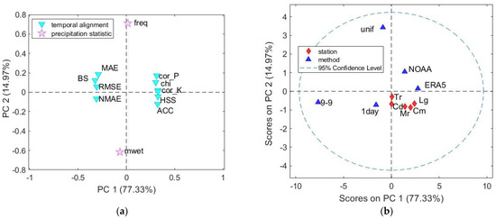 To capture the most relevant information, PCA was applied to the two-dimensional matrix 10 × 12 of Figure 7, in which the adjustment methods and the stations were considered as “samples” and the performance indicators as variables. Mean centering and variance scaling were applied as data pretreatments. The number of principal components (PCs) to be retained was selected based on the percentage of total variance explained, not to be lower than 90%. The total variance accounted for by the first two PCs was around 92%; therefore, the discussion of the results focuses on PC1 and PC2. Figure 8a shows the loading plot of PC1 vs. PC2. PC1, which is responsible for the description of 77% of the variance, measures the temporal alignment because it has large (in absolute value) association with the indicators related to this aspect. In particular, PC1 shows positive loadings for cor_P, cor_S, cor_K, χ(0.95), ACC, and HSS, with negative loadings for RMSE, MAE, NMAE, and BS. Looking at the position of the indicators in the loading plot, it is evident that the indicators of temporal alignment can be divided into two groups. The former is referred to as “correlation”, the latter to as “error” group, looking at the meaning of the indicators forming each group. In fact, the most performing method is characterized by a low value of the indicators that have negative loadings on PC1 (i.e., RMSE, MAE, NMAE, BS) and high values of the indicators that have positive loadings on PC1 (i.e., cor_P, cor_S, cor_K, χ(0.95), ACC, HSS). PC2 instead measures precipitation statistics, as both freq and mwet have high (in absolute value) loadings on PC2, with the former possessing positive ones and the latter possessing negative ones.