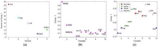 The loading plots of the first (adjustment method), second (performance indicators) and third modes (months) of the first factor are reported in Figure 9. In the first mode plot (Figure 9a), unif, NOAA, and ERA5 methods have positive scores values, with 9–9 and 1 day exhibiting negative ones. The first factor mainly differentiates the unif method (characterized by the highest score value) from the others. In particular, it is characterized by the most remarkable difference in precipitation statistics, i.e., freq and mwet, with respect to the reference series 0–24 (Figure 9b). This behavior is particularly true for the two central summer months, i.e., July and August (Figure 9c), which exhibit the highest positive scores values in Mode 3.