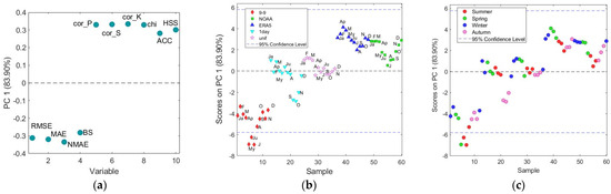 Results of PCA applied to the dataset 60 (12 months × 5 methods) × 10 (indicators): (a) loading plot of PC1; scores plot on PC1 differentiating (b) the methods and (c) the seasons.
