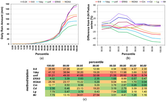 Figure 12 visualizes the results of the analysis of the percentile distribution to assess the effect of the adjustment methods on daily extremes. In Figure 12a, the values of the percentiles from the 50-ile to the 100-ile calculated for the original and adjusted daily series of Padua are compared. All the adjustment methods underestimate the percentile values, except ERA5 that outperforms all the others. The unif method exhibits the greatest difference with the 0–24 series, as it halves the values of the percentiles above the 95-ile. The same analysis carried out separately for the other stations gave similar results. Then, the adjustment methods applied to Padua series were compared to the series of the neighboring stations: the difference from the 0–24 Padua series of the percentile values from the 90-ile to the 100-ile was calculated for the adjusted series and the series of the neighboring stations. Tribano was excluded as its dataset is 3 years shorter. The results are shown in Figure 12b as percentage and in Figure 12c as absolute values. The columns in Figure 12c are colored using a three-color scale, i.e., red for the highest difference, green for the lowest one, and yellow for what is in the middle. The only series that comes close to the ERA5 method is Legnaro, the station that is most correlated with Padua (Figure 7).