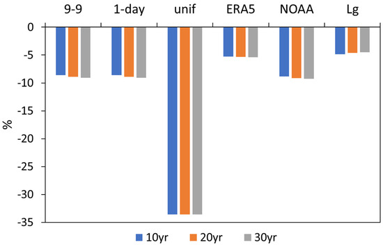 Concerning the impact of the adjustment methods on the daily precipitation percentile distribution and consequently on the identification and characterization of extreme days, the results showed that all the methods underestimate the percentile values, except ERA5 that simulates daily extremes better than taking the dataset of a neighboring station (Figure 12). When regular time series are considered, e.g., regular daily precipitation amounts, selected percentiles are directly related to the return period (RP) [44]. The precipitation amounts related to 10, 20, and 30-year RPs were evaluated for all the methods and stations considered in this study, taking advantage of a specific function (i.e., fevd) of the R extRemes package, version 2.1-3. [33]. In Figure 13, the RPs of the different adjustment methods applied to Padua datasets are compared between them and with Legnaro, the station mostly correlated with Padua; the results are expressed as a percentage difference with respect to the 0–24 Padua series. It is evident that the length of the period considered is not as important as the method. ERA5 is the method that better reproduces the RPs of the original series, followed by Legnaro; both datasets can be considered reliable candidates to fill the gap of the Padua series. The uniform adjustment is confirmed to markedly decrease the extremes and consequently increase the RPs. The same analysis carried out for the other stations gives similar results concerning the performance of the adjustment methods in terms of RPs.