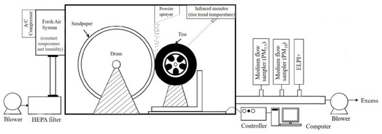 The tire wear experiment involves simulating various tire conditions using a High Dynamic Outsider Wheel Tester, which consists of a control system, tire, and drum, as shown in Figure 1. The drum is roughened with tungsten carbide to increase surface roughness, and the right drum speed drives the left tire at the same speed to simulate real-world tire travel. By controlling the drum speed, tire load, tire inclination angle, and lateral deviation angle, various test conditions can be completed. The wheel tester was installed in an enclosed antistatic plexiglass chamber (length: 3.5 m × width: 2.4 m × height: 2.2 m). A fresh air system was installed at the air inlet of the chamber to reduce the influence of the background environment. According to Hagino et al.’s research [36], when the flow rate is between 0.5 and 5 m3/min, it has no significant effect on the particle emission rates. Therefore, in this study, the wind speed of the air pump was set at 6 m/s.