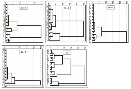 Figure 2 presents the results of a hierarchical cluster analysis on the number distribution of emitted particulate matter during tire wear processes. The figure demonstrates that the particle number distribution of the five tire samples can be divided into two categories. In Tire 1, conditions 1 to 6 and the background value belong to the first category (No. 1-1), while the other conditions belong to the second category (No. 1-2). Similarly, in Tire 2, conditions 1 to 5, 24, and the background value belong to the first category (No. 2-1), while the remaining conditions belong to the second category (No. 2-2). In Tire 3, the background belongs to the first category (No. 3-1), and all conditions belong to the second category (No. 3-2). In Tire 4, conditions 1 and the background belong to the first category (No. 4-1), while the other conditions belong to the second category (No. 4-2). Finally, in Tire 5, conditions 5, 9, 12, 16, and 20 belong to the first category (No. 5-1), and the remaining conditions belong to the second category (No. 5-2).