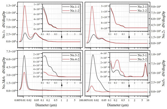Figure 3 displays typical particle number distribution examples of five tire samples measured by ELPI+. According to ELPI+’s particle size range, particles can be divided into three size segments: PN0.1 (6 nm < Dp ≤ 0.1 μm, ultrafine particles), PN0.1–2.5 (0.1 μm < Dp < 2.5 μm), and PN2.5–10 (2.5 μm ≤ Dp < 10 μm, coarse particles). It is evident that the majority of emitted particles from all samples are concentrated in the PN0.1 segment, accounting for an average of 94.80% of the total particle count. Within the PN0.1 segment, at least one clear concentration peak is observed. For example, in Tire 1, there are two concentration peaks in the PN0.1 segment. In the first distribution mode (red line), the first peak appears at 13 ± 3 nm, and the second peak at 41 ± 1 nm. In the second distribution mode (black line), the first peak appears at 11 ± 1 nm, and the second peak at 26.5 ± 7 nm. Similarly, Tire 2 exhibits two concentration peaks in the PN0.1 segment. In the first distribution mode, the first peak appears at 12.8 ± 0.8 nm, and the second peak at 34 ± 7.6 nm. In the second distribution mode, the first peak appears at 10.6 ± 0.5 nm, and the second peak at 22.8 nm. Tire 3 and Tire 4 show only one concentration peak in the PN0.1 segment, at 10.8 ± 0.9 nm and 10.6 ± 0.4 nm, respectively. For Tire 5, there is one concentration peak in the PN0.1 segment, with the two distribution modes showing peaks in the same particle size range, at 10.3 ± 0.7 nm. For the first distribution mode of Tire 1, Tire 2, and Tire 5, the concentration difference between the two peaks in the PN0.1 segment is small, while in the second distribution mode, the concentration of the second peak is lower.