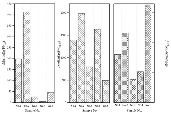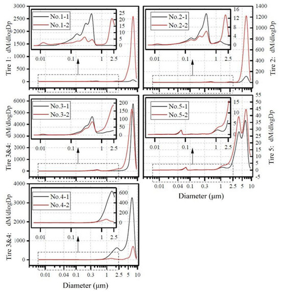The TWP emissions from tire samples also exhibit concentration peaks in the PM2.5–10 size range. The concentration peak in sample Tire 1 occurs at 6.81 ± 0.32 μm, while in sample Tire 2, it occurs at 6.88 ± 0.11 μm. In sample Tire 3, the concentration peak occurs at either 5.78 ± 0.30 μm or 6.71 ± 0.37 μm, while in sample Tire 4, it occurs at 4.43 μm or 6.83 ± 0.18 μm or 7.43 ± μm. In sample Tire 5, the concentration peak occurs at 2.53 and 7.57 ± 0.25 μm. Overall, the particle mass of TWPs is mainly composed of fine and coarse particles, with concentration peaks appearing at 0.5 μm and 1.3~2.5 μm. This result differs from the findings of Kwak et al., who detected concentration peaks at particle sizes of 2~3 μm in both test field experiments and road simulation experiments [35,38].