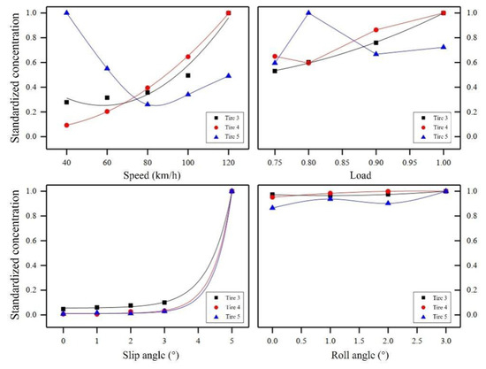 The PM10 concentration tested in the controlled variable experiment was standardized (standardized concentration = PM10 concentration/the maximum PM10 concentration obtained in each group of controlled variable experiments) to the converted PM10 concentration to between 0 and 1. Then, a fitting analysis was conducted between the standardized PM10 concentration and speed, load, slip angle, and roll angle, as shown in Figure 6 and Table 5. The results indicate that the slip angle has the most significant effect on PM10 emissions from the three tire samples, and the slip angle has a good exponential relationship with the standardized PM10 concentration (R2 > 0.999). The effect of roll angle on standardized PM10 concentration is relatively small, and as the roll angle changes, the PM10 concentration changes are also small, consistent with the range analysis results. The effect of speed on the standardized PM10 concentration of Tire 3 and Tire 4 is relatively significant, and there is a good quadratic function relationship between speed and PM10 (R2 > 0.923). The size of the tire load is related to PM10 emissions, but the differences between each sample are large. Tire 3 has a good quadratic function relationship (R2 = 0.998) between the load and PM10, while Tire 4 and Tire 5 show no clear pattern.