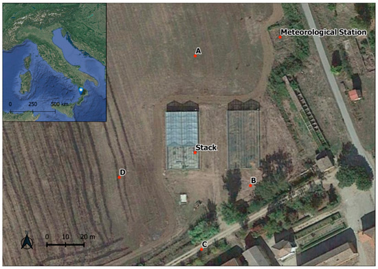 Emission sampling and determination was carried out following the ISO 16911-1:2013 (Stationary source emissions—Manual and automatic determination of velocity and volume flow rate in ducts—Part 1: Manual reference method. International Organization for Standardization. Geneva, Switzerland) and UNI EN 13284:2017 (Emissions from fixed sources—Determination of the mass concentration of dust in low concentrations—Part 1: Manual gravimetric method. Ente italiano di normazione. Milano, Italy). Sugars, metals, and VOCs were also sampled and characterized in the LASER-B laboratory of CREA-IT. At the same time as when the emission monitoring campaign was being carried out at the ARSAC site, the atmospheric concentrations of PM, metals, and sugars were evaluated. For this purpose, 4 Skypost Tecora environmental samples were used for PM10 (A, B, C, and D). Points A (north), B (east), C (south), and D (west) were positioned as shown in Figure 1. Furthermore, the use of continuous samplers for the whole campaign duration (three days) made it possible to observe the variations in PM, even when the boiler was switched off.
