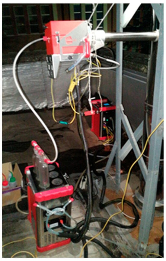 Gaseous macropollutant determination was carried out according to UNI EN 14791 (Emissions from fixed sources—Determination of the mass concentration of sulfur oxides—Standardized reference method. Ente italiano di normazione. Milano, Italy), 14792 (Emissions from fixed sources—Determination of the mass concentration of nitrogen oxides—Standardized reference method: chemiluminescence. Ente italiano di normazione. Milano, Italy) and 15058 (Emissions from fixed sources—Determination of the mass concentration of carbon monoxide (CO)—Reference method: non-dispersive infrared spectrometry. Ente italiano di normazione. Milano, Italy). The flue gas sampling system consisted of two 180 °C line heaters connected to the boiler’s stack and two gas analyzers: a Ratfisch model RS 53-T heated flame ionization detector (FID) for the detection of TOC (Total Organic Carbon) and a multiparametric analyzer (Horiba PG250) for the detection of NOx, SO2, CO2, CO, and O2. Flue gas sampling was carried out with a HP1 (DADO LAB Cinisello B., Milano, Italy) heated sampling probe with a PTFE filter. A chiller was placed between the probe and the Horiba PG 250 to avoid the condensation of the gaseous effluents.