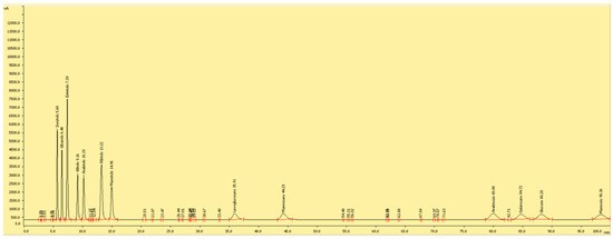 For the determination of PM and sugars, glass fiber filters (47 mm diameter) were conditioned at 400 °C and subsequently brought to a constant weight by keeping them for 48 h at constant temperature and humidity in the conditioning chamber. After sampling, the filters were reweighed and compared with a blank filter. For sugar determination, in accordance with Paris et al. [36], the filters and the impingers, kept in the dark and refrigerated, were analyzed by Ionic Chromatography (IC) using the 945 Professional Vario Amperometric Detector. The impinger solutions were directly analyzed, while the particulate was extracted three times with 1 mL H2O MQ using an ultrasonic bath for 30 min in three cycles. The separation of the single sugars was carried out out using a Metrosep Carb 2-250/4.0 analytical column, the relative pre-column, and the trap for carbonates (Metrosep CO3 Trap 1-100/4.0). The mobile phase was an aqueous solution of 18 mM sodium hydroxide (NaOH). The chromatographic run was conducted at a flow rate of 0.8 mL/min. The calibration lines were made using standard sugars with a degree of purity over 99% (Labmix24- Hamminkeln. Germany). Finally, as we knew the sampling volumes of the fumes that have passed through the filter and impingers, it was possible to obtain the emission values of every sugar detected by IC. Figure 5 shows a chromatogram of the construction of the calibration line: