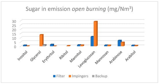 As regards sugar analysis, the calibration line was made using standards of the main sugar typically found in emissions produced by BB based on literature data [26,33,34,49,50,51,52]. Table 6 reports the analytes detected in the PM filter, MilliQ H2O impinger, and backup impinger (Dadolab srl. Cinisello B. Mialno, Italy).