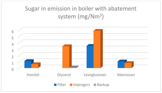 In open burning conditions, inositol, erythritol, mannitol, levoglucosan, mannosan, arabinose, and arabitol were detected in both the PM filter and the impingers. The impingers were particularly rich in sugars, suggesting that in addition to levoglucosan, the high volatility is also typical of other sugars generated by biomass combustion. In tests where a multicyclonic abatement system was used, the results obtained were very different and showed the determination of only four sugars (inositol, glycerol, levoglucosan, and mannosan). In addition to levoglucosan, one of the main analytes detected was glycerol, both in the filter and in the bubbled fractions. Another important parameter that can be seen is the extreme volatility of glycerol. In both cases, in fact, it did not settle on a filter but was determined exclusively in the volatile fraction. Excluding levoglucosan and mannosan, the others all belong to the category of sugar alcohols. These data particularly indicate that abatement systems avoid an enrichment of PM sugars (Figure 6 and Figure 7), and therefore, it is possible to distinguish the PM obtained from boilers with dedicated abatement systems, as well as the PM obtained from the open burning process.