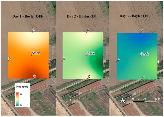 As can be deduced from the TSP results shown in Table 10, open burning produces more PM. In fact, the sum of the PM fractions in Table 8 and Table 9 is different based on the data reported in Table 10. One explanation for this difference is due to the type of sampling: the PTS sampling is continuous, while the PM fractions were sampled for time intervals (15 min). This inevitably influenced the sampling and the relative averages obtained. The other reason is gravimetric; in the case of the calculation of the PTS, obviously, the relative error for the filter weighing is referred to a single filter, while in the case of the PM fractions, the weight measurements are related to three different filters, which multiplies the relative errors of the weighings. From the filters’ gravimetric measurements of the outdoor autosamplers A, B, C, and D, it was possible to compose distribution maps of PM10 in the studied area (Figure 8). During the first day (Figure 8 (left)) with the boiler off, the ambient air autosamplers were in continuous operation from 13:00 to 10:00 the next day. In this phase, despite the inactivity of the boiler, the highest values of PM10 per m3 of sampled volume are observed due to the greater stability conditions at night, which favored the fall of the particulate present in the atmosphere. A significant contribution to the PM concentration on the first sampling day (with the boiler off, Sunday) could be attributable to vehicular traffic from the highway less than one km away from the sampling point. In the following days, with the boiler on, the autosamplers were active only during the day, when winds with greater intensity were recorded. On the third day (Figure 8 (right)), lower concentrations of PM were reported, possibly due to the shorter operating time of the boiler and higher wind speeds, which transported the PM to outside of the studied area. A comparison with local meteorological variables (Table 11) was made possible thanks to the weather station on the ARSAC site. The anemometer was not functional, and the neighboring stations of Acri (WGS84; 16.404836 east; 39.502161 north) and Corigliano Calabro (WGS84; 16.448522 east; 39.736805 north) were taken into consideration for the wind data alone. As mentioned, the north–north/west wind direction during the night of the first day was predominant in the distribution of the PM. The map shows a greater concentration in the autosampler C located to the south. During the second day (Figure 8 (center)), the anemometers in the reference stations detected variable origins and dynamics in the winds, with predominant north–north/west–south/West directions, which led to a distribution of the PM along the north–south axis. On that day, during the sampling, near station A (north), an agricultural machine had begun plowing, which meant that sampling had to be promptly suspended. This phenomenon may have influenced the sampling at point A, increasing the PM concentration. Finally, regarding the last day (Figure 8 (right)), the winds from north–north/west led to a higher concentration of PM in the south–south/east area. The following figure and table show the PM10 distribution maps and the meteorological values recorded during the sampling days, respectively.
