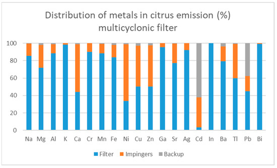The use of the multicyclone resulted in a strong reduction in the metals released into the atmosphere. In fact, they are often transported by the PM, which facilitates the transport; therefore, in the tests with the multicyclone, we noted negligible concentrations in the backup bubbler. Cd and the Pb show a different behavior, with high concentrations being detected in the backup bubblers by virtue of their high volatility. These data are more recognizable in Figure 9, which represents the values listed in Table 12 as percentages of the distribution.