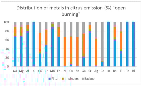 The distribution of the metals in the emissions from citrus pruning combustion in a boiler equipped with a multicyclonic filter (above) and without any filter in “open burning” conditions (down).