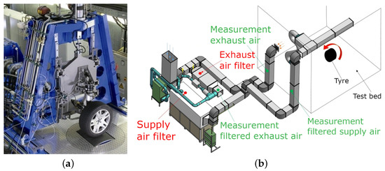 A special characteristic of the test bed is the closed ventilation system, shown in Figure 1b. Intake air with a volume flow of 2707 from the environment is led through the supply air filter in a continuous flow and passed into the measuring room via several ventilation outlets. The exhaust air is displaced through one ventilation opening and led through the exhaust air filter before being ventilated into the environment. The filters are described in the Section 2.3.