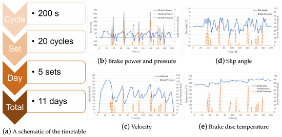 A representation of the used test programme on the wheel and suspension test bed. (a) The structure of the programme and (b–e) selected time-dependent parameters of the test cycle; see Appendix B for details.