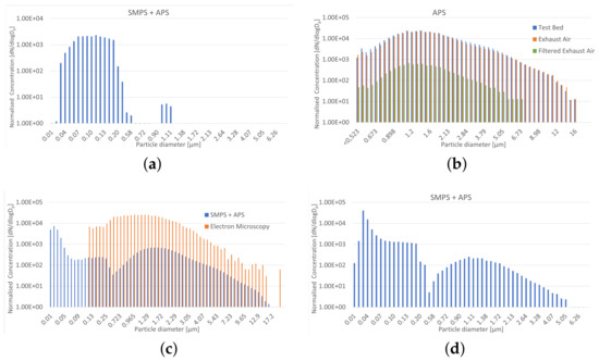 Figure 3b shows data from APS measurements at different sampling positions; the shape of the distribution does not change, while the concentrations differ. A similar behaviour can be observed by comparing Figure 3c,d; the shape of the distribution in the filtered exhaust air is very similar to the one measured in the exhaust air, but the concentrations differ.