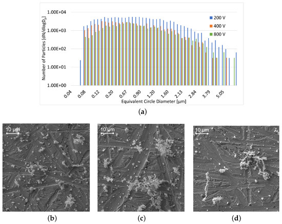 All samples were scanned automatically, and the single particles were analysed for size and composition. For samples taken from the exhaust air filter, the PSD can be seen in Figure 3c, along with the corresponding PSD acquired with aerosol instrumentation. The PSD from the different deposition stages of the electrostatic sampler can be seen in Figure 5a, and the corresponding total numbers are listed in Table 2. The found particle sizes in terms of ECDs do not match the expected sizes according to the calculations of the mobility diameter. As shown in Figure 5a, the shape of the PSD is very similar for all three plates, and the 0 reference plate was found to be particle-free. The separation of particles between the deposition stages was instead determined by structural properties, as indicated in the exemplary EM images in Figure 5, and composition, as described below. The aggregates seen in Figure 5b from the 200 plate are comparatively small, the largest were found on the 400 plate and are shown in Figure 5c, while the particles in Figure 5d, from the 800 plate, are similar to soot particles.
