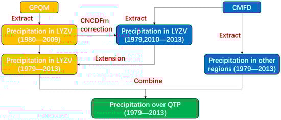 Flowchart for producing historical precipitation data over the QTP based on GPQM and CMFD.