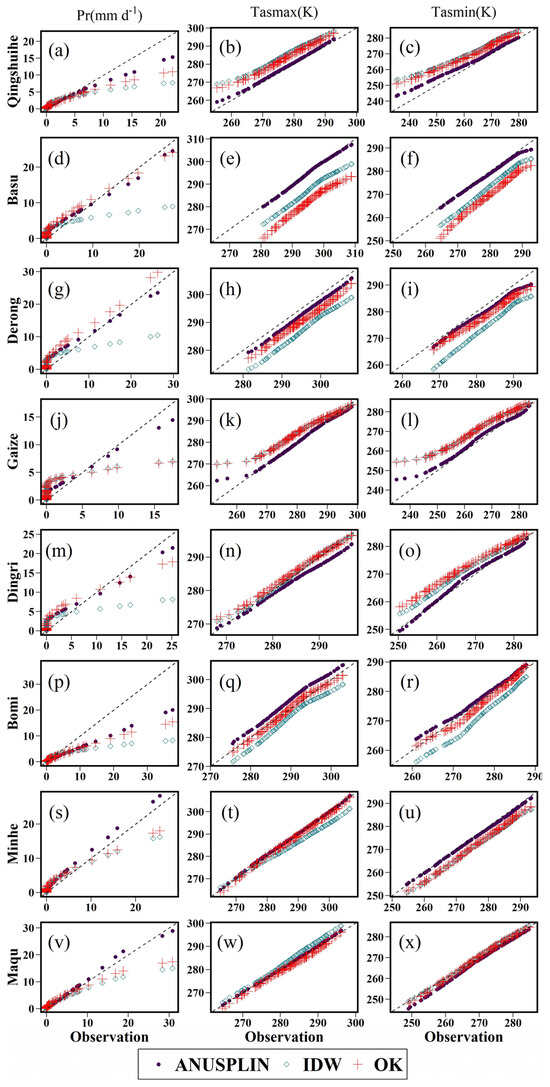 Figure 3 demonstrates that ANUSPLIN provides a better fit to the ‘x = y’ line at most stations. For precipitation, OK consistently overestimates light rain and underestimates heavy rainfall, as indicated by the red crosses in Figure 3. IDW exhibits the same issue at Gaize and Qingshuihe stations, represented by blue prisms in Figure 3a,j. At other stations, IDW tends to overall overestimate precipitation. For temperature, both IDW and OK consistently overestimate temperatures at high-altitude stations (Qingshuihe, Gaize, and Dingri, whose altitudes are higher than 4000 m) and underestimate at relatively low-altitude stations (Basu, Derong, and Bomi, whose altitudes are lower than 3000 m). This is likely because they do not account for the linear relationship between temperature and elevation. Overall, ANUSPLIN (indicated by purple dots in Figure 3) outperforms the other two methods in addressing the above issues, especially when fitting precipitation extremes, which is crucial for regional hydrological research.