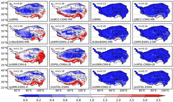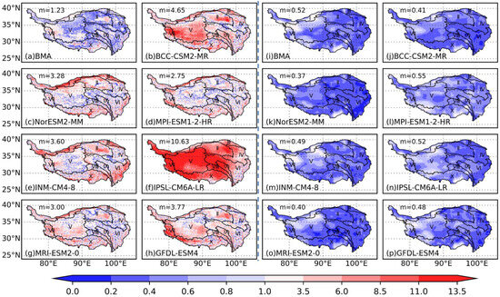 The AMBs before and after correction are shown in Figure 4, Figure 5 and Figure 6, showing a substantial reduction in the AMBs after bias correction across all three variables from the seven GCMs and BMAs for the historical period (1979–2013). The outputs of these three variables from the seven GCMs all showed large biases before correction, as depicted in Figure 4, Figure 5 and Figure 6b–h. For precipitation, the AMBs of seven GCMs ranged from 0.87 to 1.73 mm d−1, some of them were even higher than the mean precipitation over the QTPs (1.24 mm d−1 approximately); the high bias value (≥3.00 mm d−1) occurred in the southeast of the QTP, covering the southern parts of IDR, YLZBR, YZR, MKR, and SWR, before bias correction (Figure 4b–h). For temperature, seven GCM AMBs ranged from 1.35 to 6.84 K (maximum surface temperature, Figure 5b–h) and from 1.23 to 10.63 K (minimum surface temperature, Figure 6b–h). For maximum surface temperature, the high bias value (≥8.50 K) occurred at the edge of QDB and most of TMR, IDR, and YLZBR; for minimum surface temperature, the high bias value (≥8.50 K) occurred in the western part of the QTP (TMR, IDR, and western parts of IQTB and YLZBR) and small parts of QDB, before bias correction. Therefore, such uncorrected data cannot be used for climate research and decision-making at the regional scale [31]. After bias correction, the GCMs’ absolute mean bias was reduced to an acceptable range. For precipitation, it was from 0.13 to 0.19 mm d−1 (about an 85% to 89% reduction Figure 4j–p). For temperature, they were from 0.40 to 0.64 K (maximum surface temperature, Figure 5j–p) and from 0.37 to 0.55 K (minimum surface temperature, Figure 6j–p). High values only occurred in smaller areas compared with uncorrected data. For precipitation, only NorESM2-MM exhibited high AMB (≥3.50 mm d−1) in a small part of LYZV (Figure 4k). The reduction in bias for mean annual precipitation, as well as the maximum and minimum temperatures, demonstrates the effectiveness of our bias correction based on CNCDFm.