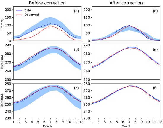 The seasonal cycle of precipitation, as well as maximum and minimum temperature, before ((a–c), on the left side) and after ((d–f), on the right side) bias correction. Comparison of the Bayesian model averaging (BMA, blue) mean seasonal cycle of bias-corrected (a,d) precipitation, (b,e) maximum temperature, and (c,f) minimum temperature against the observations for the 1979–2013 period (red). The shaded area represents the uncertainty (from minimum to maximum) of all 7 CMIP6 GCMs.