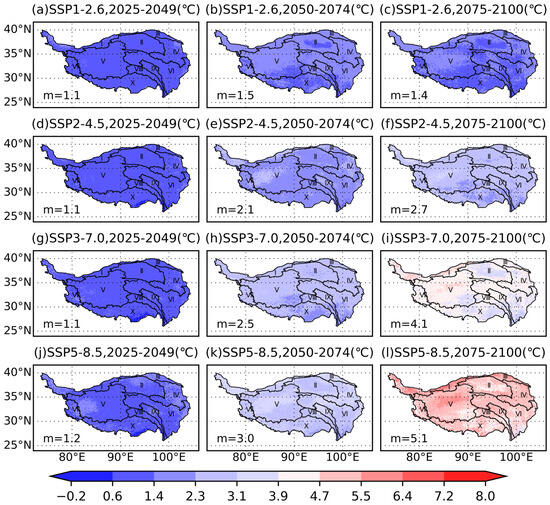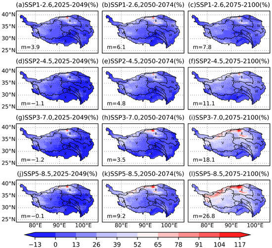 Future change of precipitation (%) against historical baseline (1985–2010) based on corrected BMA. (a–c) The projected change in mean annual precipitation for the SSP1-2.6 in the near (2025–2049), medium (2050–2074), and far (2075–2100) future; (d–f), (g–i) and (j–l), the same as (a–c) but for SSP2-4.5, SSP3-7.0, and SSP5-8.5, respectively. The mean change across the entire QTP (m) is shown in each panel as m. The numbering of each subregion (consistent with Figure 1) is also indicated in each subfigure. The numbering (I–X) of each subregion (consistent with Figure 1) is also indicated in each subfigure.