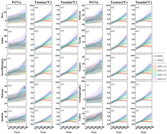 Future precipitation and temperature were also estimated in 10 subregions based on corrected BMA (Tables S1–S3), as seen in the Supplementary Materials, Figure 8, Figure 9 and Figure 10. The projections indicate increases in the mean annual precipitation and maximum and minimum temperatures across these subregions under middle and high radiative forcing pathways (SSP2-4.5, SSP3-7.0, and SSP5-8.5), with significantly higher increases across high radiative forcing scenarios compared to low radiative forcing ones, aligning with projections for South Asia [31]. Notably, under SSP3-7.0 and SSP5-8.5, all three variables are projected to continue to rise, which is consistent with the overall trend across the QTP. Under SSP1-2.6, the precipitation trend in HXB, IDR, IQTB, QDB, and TMR in the far future is lower than in the middle future, a trend likely attributed to the mitigating effects of reduced greenhouse gas concentrations on climate change. Overall, the bias-corrected dataset produced a reasonable projection for subregions in the QTP, and it is available for hydroclimatic research at the regional scale.