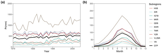 As for the scope of the Qinghai-Tibet Plateau, there are different definitions in different studies. We adopted the high-frequency use scope of the QTP (HF-QTP) as defined by Zhang et al. [33], which included several major river headwaters and can match most research requirements. The QTP ranges from 25°59′37″ N to 39°49′33″ N and from 73°29′56″ E to 104°40′20″ E, covering an area of 2542.30 × 103 km2 [34]. Its altitudes range from 85 m to 8233 m, and approximately 90.9% belong to high altitude (>3000 m) areas. This range includes the world’s highest mountains and massive deep valleys in terms of topography. The complex terrain of the QTP results in a complicated distribution of precipitation and surface temperature. A brief overview can be seen in Figure 1. These regions can be divided into ten subregions based on watershed [35,36], as follows: I. Tarim River (TMR); II. Qaidam Basin (QDB); III. Hexi Basin (HXB); IV. Yellow River (YR); V. Inner of Qiangtang Basin (IQTB); VI. Yangtze River (YZR); VII. Indus River (IDR); VIII. Salween River (SWR); IX. Mekong River (MKR); and X. Yarlung Zangbo (YLZBR). Among these, IQTB and QDB belong to the inland river basin, and some of the river channels are seasonal. We obtained the river distribution of QDB from National Basic Geographic Information [37]. Currently, there are only 131 long-observed meteorological stations in the QTP (Figure 1) maintained by the China Meteorological Administration (CMA). They are primarily situated in the eastern part of the QTP, with observations lacking in the western part of the plateau. The digital elevation model (measured from sea level, DEM, units: m) used in this section and Section 2.5 is provided by the National Tibetan Plateau Data Center “https://data.tpdc.ac.cn/ (24 March 2021)” [38].