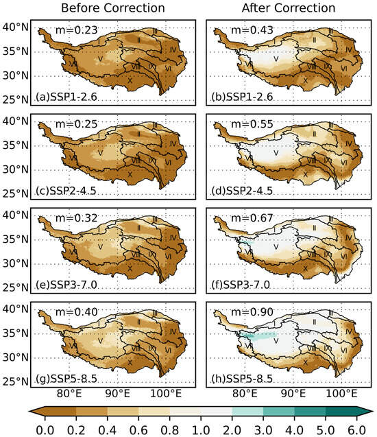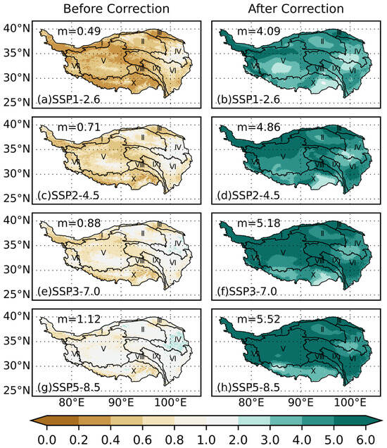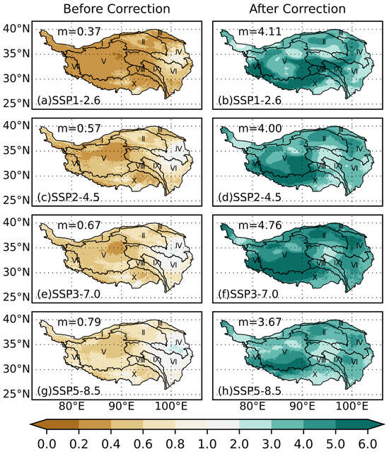 Absolute mean bias (AMB) for precipitation (mm d−1) between individual models in CMIP6 and observational data over the QTP, AMB before correction on the left of the blue dotted line (a–h), AMB after correction on the right side (i–p). The mean value of AMB across the entire QTP is denoted in each subgraph as m; m is defined as the sum of all grid point values divided by the total number of grid points over the Tibetan Plateau, as shown in the following figure. The numbering (I–X) of each subregion (consistent with Figure 1) is also indicated in each subfigure.