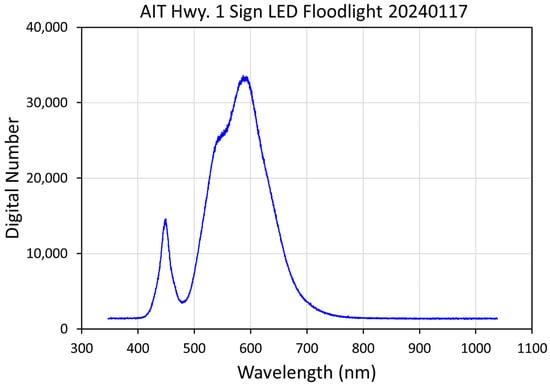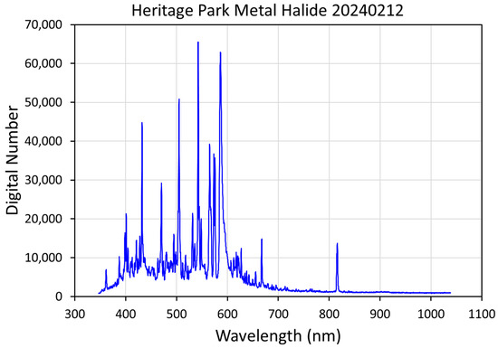 Metal halide luminaires belong to the high-intensity discharge (HID) class of lights, along with sodium lights. Metal halides produce light with high-temperature plasma inside a sealed glass enclosure [46]. Photons are produced when excited electrons in the plasma drop to lower-energy orbital shells. The compositions of the plasmas are variable mixtures of mercury, argon, xenon, and metal halides, (e.g., sodium iodide and scandium iodide). Manufacturers manipulate the plasma constituents to achieve various color profiles and color temperatures. Thus, metal halide spectra are highly variable depending on the constituents used in the glass enclosures. Figure 3 shows the spectrum of a tall-pole-mounted cluster of metal halide luminaires at the Heritage Park sport fields in Henderson, Nevada.