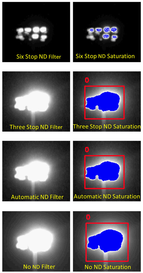 The maximum count images from each MP4 collection were tested for the presence of saturation by color coding DN = 255 as a specific color. Saturation at peak radiant output was found in many of the lights measured without a neutral density (Figure A9, Figure A16, Figure A20, Figure A24, Figure A34, Figure A38, Figure A44, Figure A46 and Figure A57). To examine the reduction in saturation via neutral density filters, collections were taken from a Heritage Park metal halide cluster with five neutral density filter settings: (1) no neutral density filter; (2) Sony camera automatic neutral density filter; (3) Sony camera three-stop neutral density filter (12.5% transmissivity); (4) external six-stop neutral density filter (1.56% transmissivity); and (5) external 16.5-stop neutral density filter (0.001% transmissivity). No lighting was detected when the 16.5-stop ND filter was used.