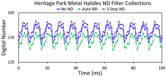 Figure 6 shows the temporal profiles for lighting cluster “0” from the no-ND, automatic-ND, and three-stop ND settings. These appear very similar to the temporal profiles from the original collection performed on these luminaires with a no-ND filter (Figure A36, Figure A37 and Figure A39). The profiles show flicker, but the amplitude is dampened by saturation during the peak part of the flicker cycling. Another factor contributing to a dampening of the flicker cycling is the lack of synchronization among the lights inside the saturation blobs. The profiles have a jagged appearance, which is a tip-off indicating partial destructive interference from multiple unsynchronized luminaires present in the cluster. The peak count is near 135—far below the saturation level of 255. This is due to the inclusion of glow and background pixels inside the rectangular sampling area. The temporal profiles in Figure 6 are not synchronized because they come from three separate MP4 collections.