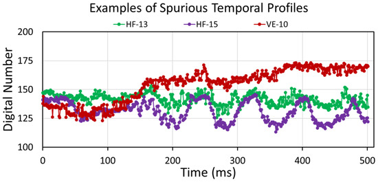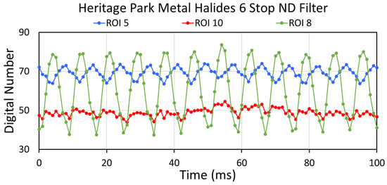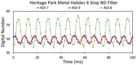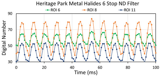 Figure 8 shows temporal profiles for three synchronized lighting clusters (6, 8, and 11) from the six-stop ND collection. The flicker amplitudes are high and lack the multiple jagged features seen in the saturated profiles (Figure 6), attributed to partial destructive interference. Two other lights (7 and 9) show synchronization with each other but lower amplitude (Figure 9). In addition, there are two outlier temporal profiles from clusters 5 and 10 (Figure 10). Cluster 5 shows the classic sawtooth pattern found when mixing light from two non-synchronized sources (Figure A14 and Figure A15). Cluster 10’s temporal profile is similar to those from the saturated clusters from the no-ND, automatic-ND, and three-stop ND collections. This indicates the mixing of light from several unsynchronized sources.