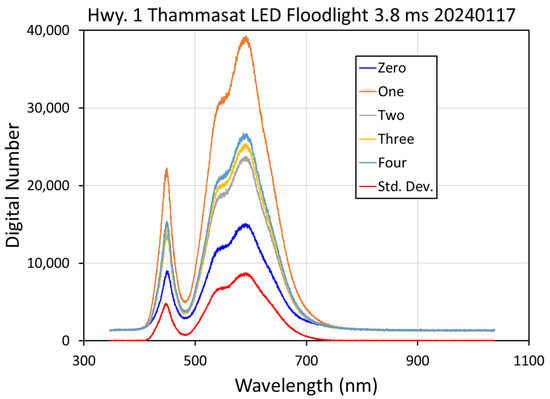 A set of 3.8 ms integration time spectra of an LED spotlight illuminating the wall sign at the entrance to Thammasat University along Highway 1, north of Bangkok. The standard deviation was calculated from five individual spectra.