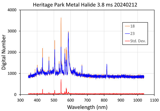 USB4000 spectra of a tall pole assemblage of metal halide bulb at the Heritage Park sport fields in Henderson, Navada. The chart shows two temporal profiles and the standard deviation calculated from twelve individual spectra.