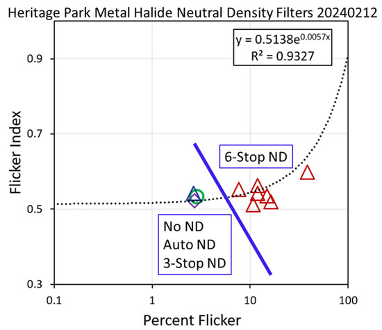 Percent flicker versus flicker index for the neutral density filter collections on a tall pole lamp metal halide cluster at the Heritage Park sport fields in Henderson, Nevada. The no-ND, auto-ND and three-stop ND index values are locked together due to saturation effects. These are to the left of the blue diagonal line. The six-stop ND data points are located to the right of the blue line, eliminated nearly all of the saturation, making it possible to identify seven individual lighting features with substantially higher percent flicker levels than the saturated observations. The regression line from Figure 14 is repeated here, along with the regression formula. The other two boxes are data labels.