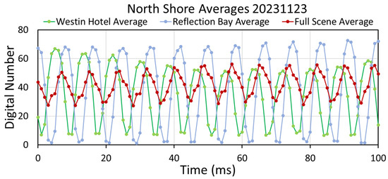 If all the luminaires in a scene are flickering in synchronization, the flicker will be expressed well in the full-scene temporal profile. We found that the flicker is frequently synchronized at the level of individual homes or facilities and for strings of streetlights having shared power supplies. The full-scene averages provide simulations of the flicker level observed by satellite sensors, such as VIIRS. If there are phase differences in the flickering of luminaires within a scene, destructive inference dampens the scene’s average flicker. In some cases, this results in the complete loss of flickering at the full-scene level. However, in many cases, the flicker is still detectable, but the shape of the profile is affected through the interplay of multiple flicker sources having partial synchronization. An example of this is found in the North Shore flicker profiles, where the full-scene temporal profile has a sawtooth pattern (Figure 16). In each flicker cycle, there are two places where the Westin and Reflection Bay lines cross. These crossover points are near the peak and trough of the full-scene average. A sawtooth pattern in full-scene average temporal profiles is an indicator of the partial destructive interference of the various flickering sources present.