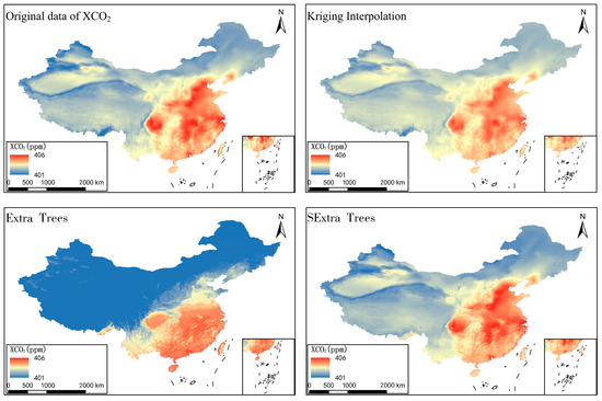 - The SExtraTrees model proposed in this study is an effective technique for predicting national long-term time series XCO2 data. The SExtraTrees model outperforms Kriging interpolation and extreme random trees models in terms of model fitting and prediction while maintaining spatial consistency with the original XCO2 data and ensuring high predictive accuracy.
