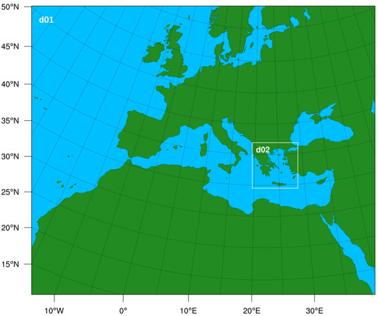 In order to assess the effect of dynamical downscaling on the prediction ability of the model, limited area numerical forecasts were performed using version 4.1.2 of Advanced Research WRF model [74]. The outer domain (d01) employed a horizontal grid spacing of 25 × 25 km and covered Europe, northern Africa, western Asia and a large part of the northern Atlantic to represent the synoptic scale flow. The inner nested domain (d02) covered Greece and western Turkey with a finer grid spacing of 5 × 5 km in order to investigate the effect of fine resolution forecasts on the predictability of the heatwave. The NCEP/CFS analyses and forecast fields of the control runs were utilized as initial and boundary conditions (for d01, updated every six hours) because they provided all the necessary input fields for the WRF runs. In total, 42 simulations were performed with initialization dates from 9 April 2020 00 UTC to 29 April 12 UTC (two initializations starting at 00 and 12 UTC daily). The characteristics of the WRF forecasts are summarized in Table 3 and the telescoping domains are depicted in Figure 1. All the simulations had the same forecast horizon (until 31 May 2020). This forecast horizon was selected to identify any temporal shifts in the predictions of the heatwave as the heatwave occurred between 11 and 20 May. The Moderate Resolution Imaging Spectroradiometer 21-category dataset from the International Geosphere Biosphere Program (MODIS-IGBP) was used for the specification of the land-use categories and the United States Geological Survey (USGS) dataset was used for the topography.