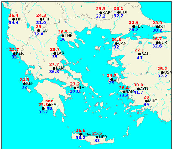 As mentioned previously, the peak intensity of the heatwave was found on different dates, but the most robust results were provided by the EHF from the weather stations as the reanalysis data do not perfectly describe the state of the atmosphere [48,49]. The peak intensity of the EHF occurred on the 16th and 17th of May. The majority of the maximum temperatures, which were measured by the weather stations of NOA and the Hellenic National Meteorological Service (HΝMS) across Greece and the surrounding countries, were observed on 16 May 2020 (Figure 2). The highest temperature (40 °C) in Greece was recorded in Kalamata city (KAL in Figure 2). The KAL station is owned by HNMS and it does not have a complete temperature time series to derive its reference climatology 95th percentile maximum temperature (nan in KAL). However, it was included in the map because it exhibited the highest maximum air temperature recorded in Greece during the event. This was a record high (absolute maximum) 2 m temperature for Kalamata for the month of May. The same temperature (40 °C) was recorded again the next day (17 May). In agreement with [42], mesoscale features seemed to have affected the maximum temperature at the airport of Kalamata (where the maximum 2 m temperature of 40 °C was observed in Greece on 16 May 2020). Hot and dry light winds from the land, together with the insolation, appeared to have contributed to the synoptic scale warm advection at the lower troposphere, in order to reach a 2 m temperature of 40 °C at 12:20 p.m. local time (09:20 UTC) on 16 May. However, the onset of the sea breeze and the proximity to the coast (at a distance of 4 km) led to an abrupt decrease in the 2 m temperature by 6 °C in the next 30 min. Despite the clear sky and the insolation of the early afternoon hours, the 2 m temperature dropped further to 30 °C until 16:50 local time (13:50 UTC) under the influence of the sea breeze. The highest temperature (42.6 °C) in the whole region of interest appeared in Aydin, Turkey. This temperature was 11.7 °C higher than its T2max95 and it was also the highest maximum temperature recorded for the month of May in Aydin. Additionally, all the stations shown in Figure 2 exceeded their T2max95 of May by 2 to 11 °C (reference period: 1975–2005).