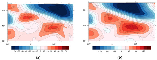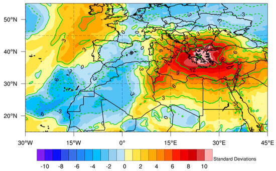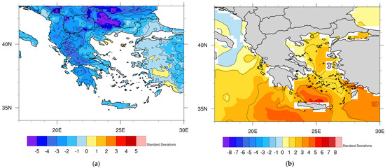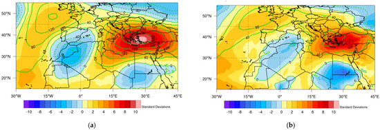 Furthermore, in Figure 6, a strong positive anomaly in the geopotential heights was observed above Greece and western Turkey. Specifically, above the Aegean Sea and southwestern Turkey, the geopotential height anomalies at 500 hPa (Figure 6a) and 850 hPa (Figure 6b) were, respectively, at least ten and seven standard deviations higher than the climatological value of May. On the other hand, there was a negative anomaly in the geopotential heights at the trough above Morocco, which was intense, but not as extreme as the positive anomaly. This dipole of anomalies amplifies the poleward flow and the advection of warm air masses from northern Africa to the Mediterranean Sea and southern Europe [91,92].