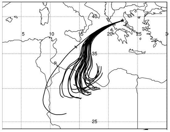 The 72 h airmass backward trajectories of the warm airmass above mainland Greece on 16 May 2020 at 12 UTC. Terminal point (star sign in the map) coordinates: 39.64° N, 22.42° E; altitude: 1500 m above mean sea level (data: CFS reanalysis) (https://www.arl.noaa.gov/hysplit, accessed on 25 February 2024). Map boundaries: 24° N–42° N, 2° E–30° E. The latitudes in ° N (longitudes in ° E) are displayed within the graph at 17.5° E (37.5° N).