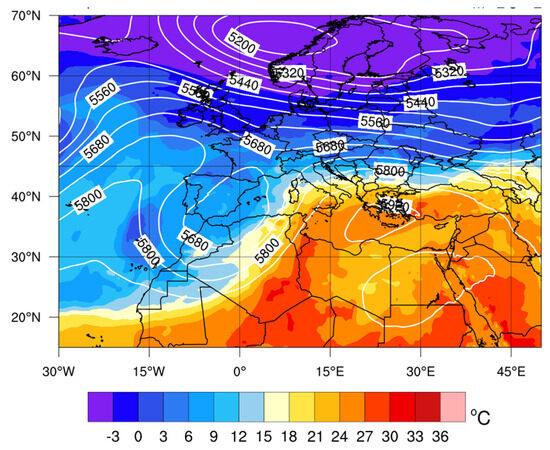 Temperature (°C—colour shading) at 850 hPa and geopotential height (gpm—contours) at 500 hPa at 12 UTC on 16 May 2020 (ERA5).