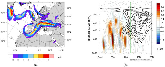 (a) Wind speed (m/s; colour shading) at 300 hPa. (b) Cross-section at 23° E of omega (Pa/s—colour shading) and zonal wind speed (stronger than 10 m/s—contours) (ERA5). Green lines mark the minimum and maximum latitudes of the study region.