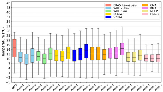 Boxplots of the 850 hPa temperatures (°C) predicted by WRF (25 km and 5 km grid spacing) and the six global S2S forecasts for the initialization dates of 9–15 April 2020 (week 1), 16–22 April 2020 (week 2) and 23–29 April 2020 (week 3). The validation period was 8–23 May 2020 at 00 UTC of each day. All the forecasts (global models and WRF) and the ERA5 reanalysis were interpolated to the same grid (34.5° Ν–42° N, 19.5° E–29.5° E) with a grid spacing of 1.5° × 1.5°.