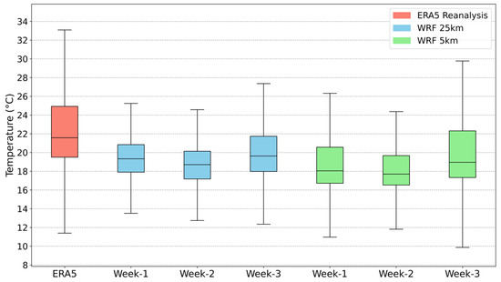 The boxplot diagrams of the WRF deterministic forecasts of the daily maximum 2 m temperature (T2max; Figure 10) had smaller temperature ranges than ERA5, spanning from 9.9 to 29.8 °C (WRF 5 km from week 3), while the range of the reanalysis was from 11.2 to 33 °C. Figure 10 shows that the WRF forecasts could not predict the extreme high temperatures in week 1 and week 2. Although WRF 5 km predicted higher temperatures in Q4 than WRF 25 km, its median was lower than that of WRF 25 km. Week 2 presented the same behaviour as week 1, but in week 3, both WRF 25 km and 5 km showed an improvement. More specifically, the Q3 and Q4 of WRF 25 km increased. The same occurred with WRF 5 km, which exhibited a larger increase in Q4 than WRF 25 km. Quantitatively, the difference between the high extremes was Q4-reanalysis − Q4-WRF-5km = 3.2 °C, while Q4-reanalysis − Q4-WRF-25km = 5.4 °C in the WRF forecasts from week 3.