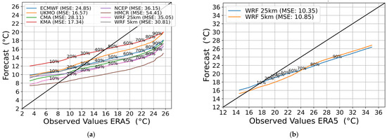 Looking into the quantile–quantile (Q-Q) distributions of the predicted temperatures using the full distribution of the global forecasts, and the deterministic WRF forecasts and the reanalysis at 850 hPa from week 3 (Figure 11a), it is obvious that the highest temperature quantiles were underestimated by all the models. Regarding the upper tail (>90%), the highest resemblance with the reanalysis was achieved by KMA and UKMO. Additionally, UKMO had the closest distribution fit with ERA5 as its mean squared error (MSE = 16.57) was the smallest of all the models. Generally, the S2S models and reanalysis agreed (i.e., they are closer to the diagonal) mostly at the quantiles between 15% and 50%. WRF 5 km had higher temperatures than 25 km across all the distribution percentages at 850 hPa. In Figure 11b, WRF 25 km and 5 km had similar maximum daily temperature distributions at 2 m and both nests presented similar MSE values. In the quantiles above 70%, WRF 5 km presented slightly higher temperatures and was closer to ERA5 than WRF 25 km. However, the maximum temperatures were underestimated in the 850 hPa Q-Q profile. For example, the 90% quantile was underestimated by WRF by 5.2 °C. In higher quantiles, the gap between WRF and ERA5 increased.